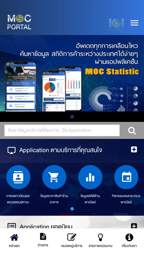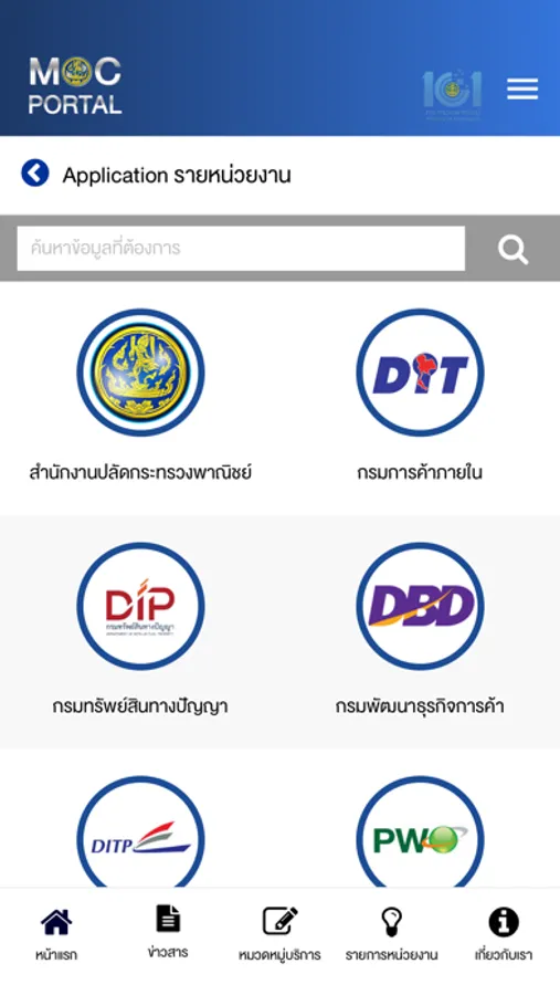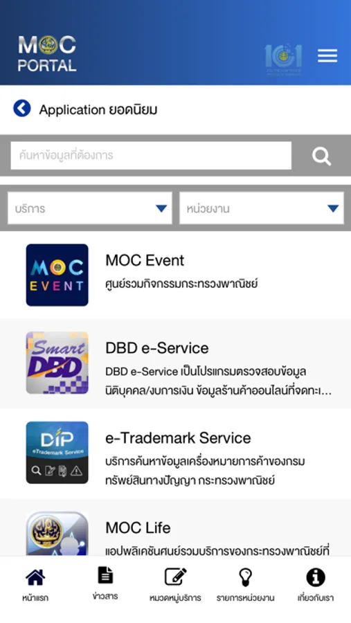 - ค้นหาแอปพลิเคชั่นตามหมวดหมู่ และหน่วยงานภายในกระทรวงพาณิชย์