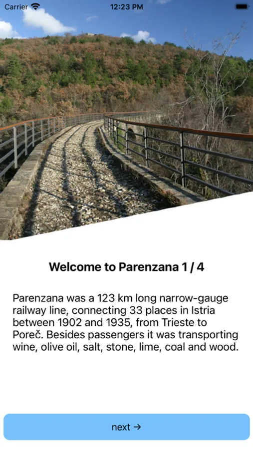 The app contains a map with the Parenzana route in Croatia (from Poreč to Plovanija-Sečovlje border crossing). In total it's about 78 km. It also contain various side tracks leading to interesting locations around Parenzana.