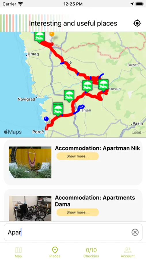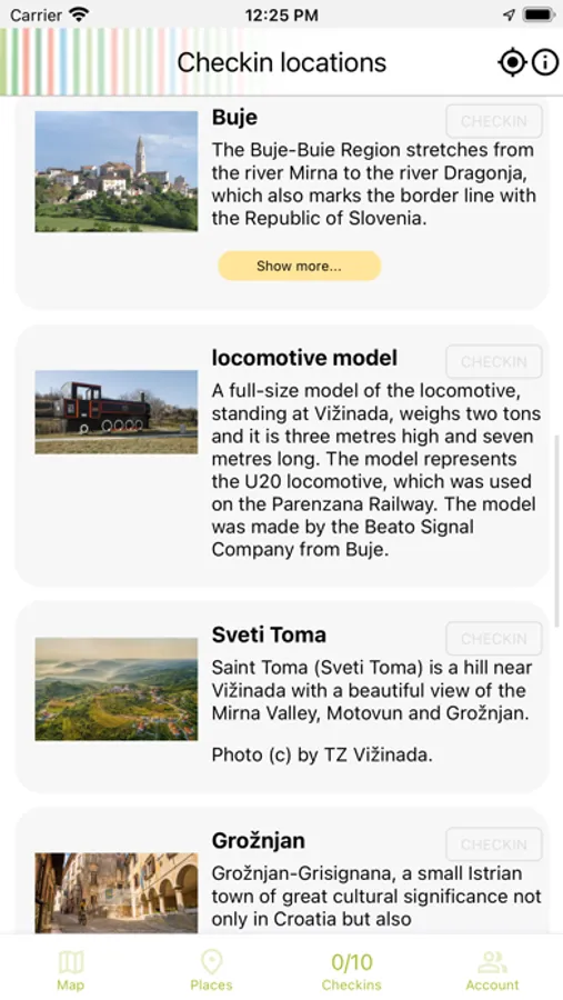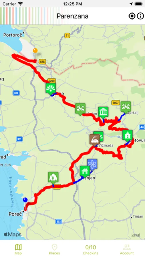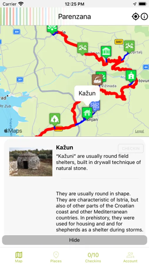 If you want you can use the app for navigation or you can "collect" checkins and become an official (and certified) "Friend of Parenzana". To get that you need to checkin on at least 10 of the predefined checkin locations. Checkins are your (selfie) photos which must be made in those places.