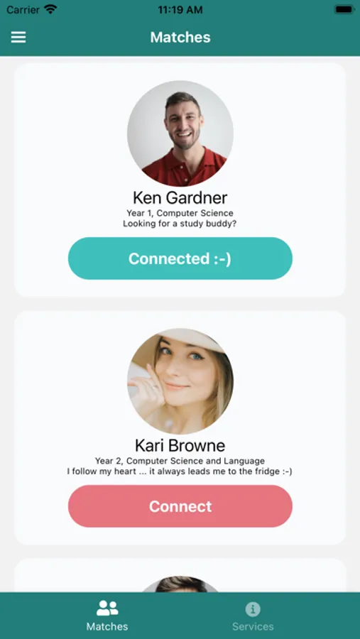 Our matching algorithm then provides users a list of potential matches within their college community. You can view their user profiles and choose someone to connect with.