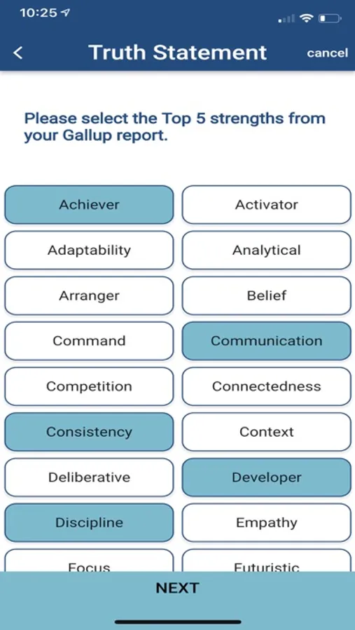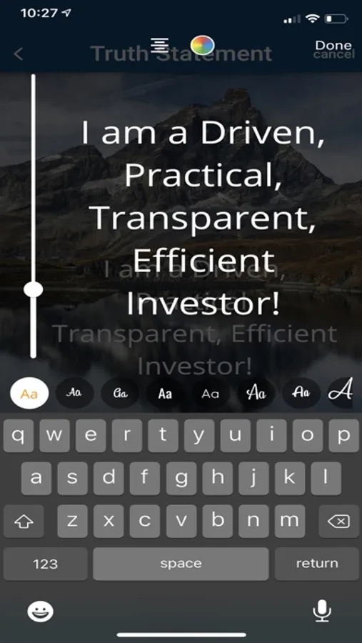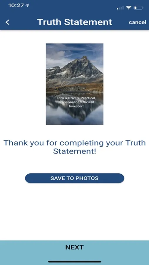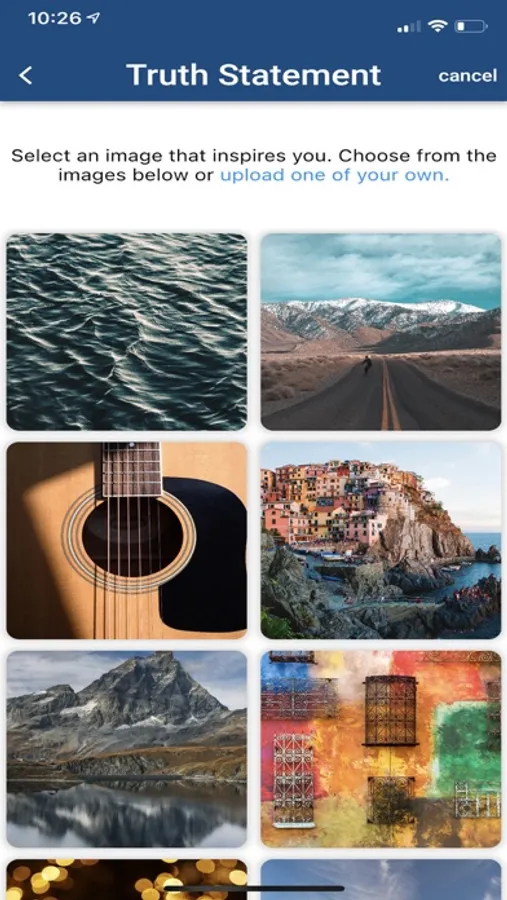 B23's Truth Statement app allows you to leverage the results from your Gallup report and guides you through the process of establishing your truth statement. You'll have the opportunity to upload an inspirational image or select from a default portfolio of images to be the back drop of your resulting truth statement. You'll be able to edit the font, color, size, alignment and positioning of the truth statement text and then save the final image to your phone.