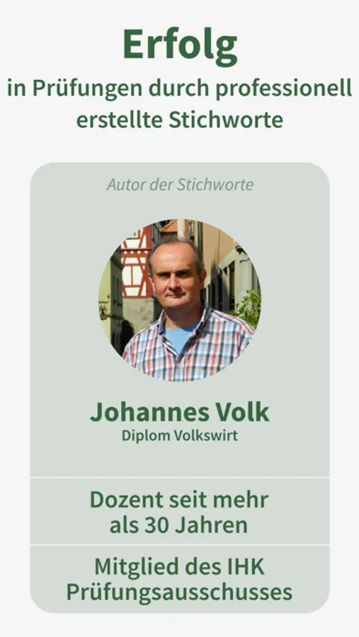 Johannes Volk ist erfolgreicher Dozent für die Fachbereiche Volkswirtschaftslehre, Rechnungswesen, Finanzierung / Investition, Bilanzierung, Controlling sowie Finanzmathematik und begleitet angehende Fach- und Betriebswirte bis zur Prüfung. In den genannten Fachbereichen lehrt er seit über 30 Jahren an verschiedenen Bildungsträgern, vorwiegend im Hamburger, Lübecker und Schweriner Raum.
