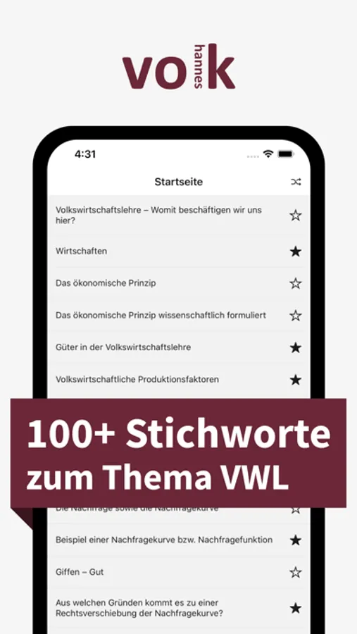 Die „Volkswirtschaftslehre (VWL) – Stichworte“ App, geschrieben von Johannes Volk, widmet sich sämtlichen Studierenden, Lehrlingen und Auszubildenden, die sich auf eine Klausur oder Prüfung im Bereich Volkswirtschaftslehre vorbereiten möchten, sowie Personen, die sich grundlegendes Wissen aus dem Fachbereich VWL aneignen möchten. In über 100 Stichworten werden elementare Begrifflichkeiten, Aspekte und Zusammenhänge aus der Welt der Volkswirtschaftslehre einfach und präzise erklärt.