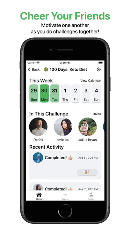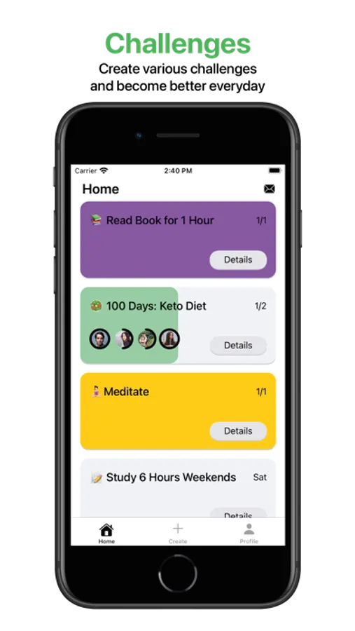 Create brand new challenges or from the suggested challenges. Go at it alone or invite your friends to make it better!