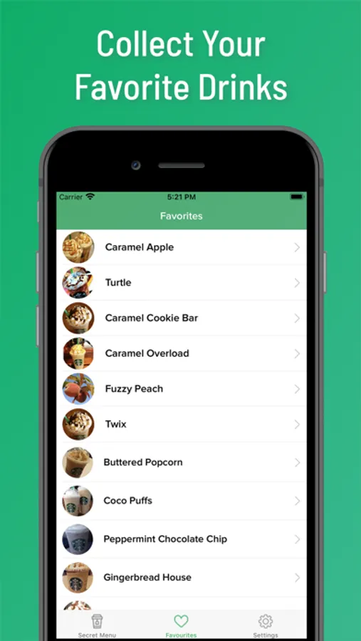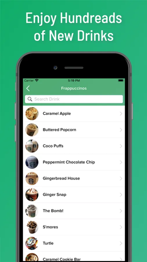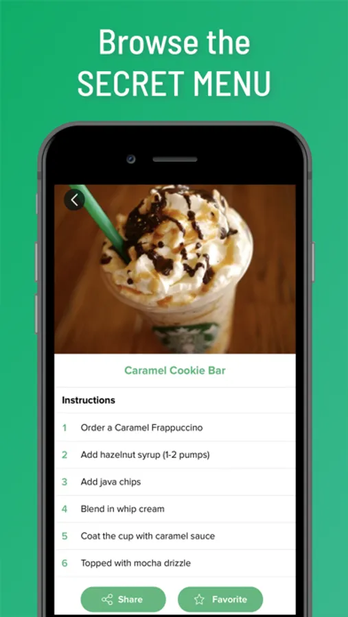 Enjoy hidden drinks : Browse through all-new secret menu drinks like the Billie Eilish Frappuccino, Cookie Dough Frappuccino, Pink Drink Refresher, Candy Cane Hot Choco, and hundreds more!