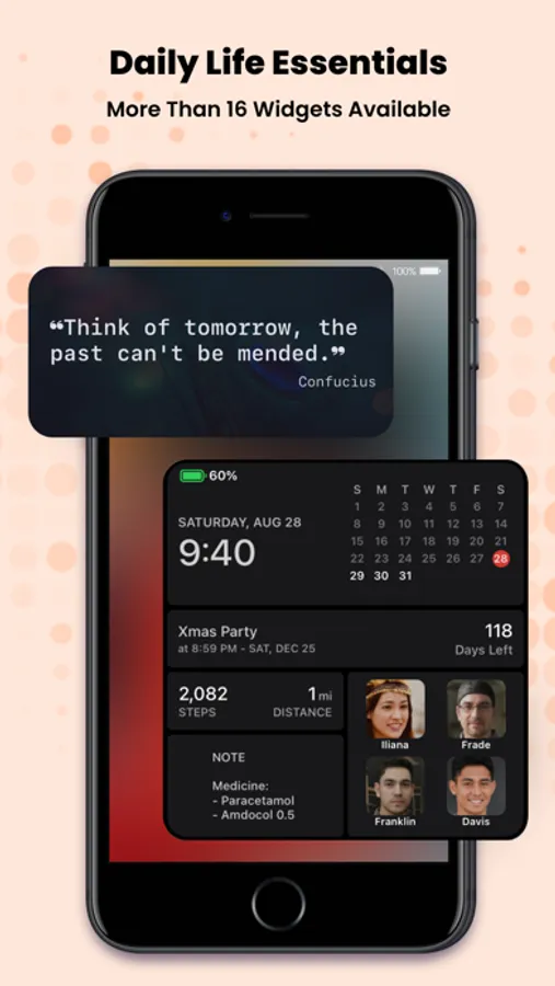 Combo Widget lets you organize your home screen by using daily life items. Normally, widgets represent unique items, whereas we represent both unique and combo items. Our idea is to represent widget does more useful like we added the calendar, battery, steps, distance, reminder/timer, sticky notes, call/dial option in a single widget.