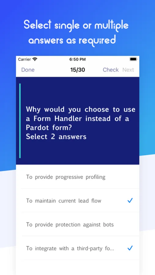 The quiz contains 120 questions about various Pardot topics divided into 4 groups of 30 questions. This smaller segmentation allows to practise and revise in smaller time intervals, where some questions may appear very similar to the real exam, others will fill the knowledge gaps. The purpose of the revision quiz is to go through Pardot logic so you can make the correct decision when a question is presented in real exam. The types of questions are the same format as the exam: