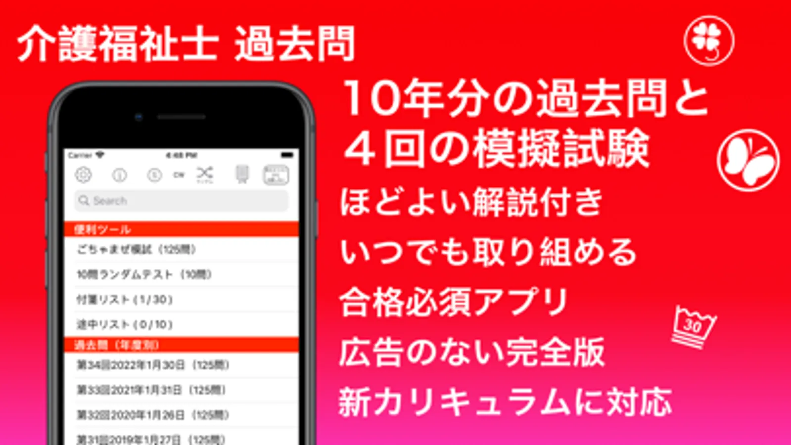介護福祉士の過去問をアプリ化。最新の問題を掲載し、ほどよい解説付き。過去問検索やマイリスト機能。10問テストなど、受験したときにあったら良かったと思う機能を搭載しています。無料版の内容に加え、模擬試験がプラス2回分あります。広告がなく、スムーズに勉強することができます。更新も有料版を優先して行います。