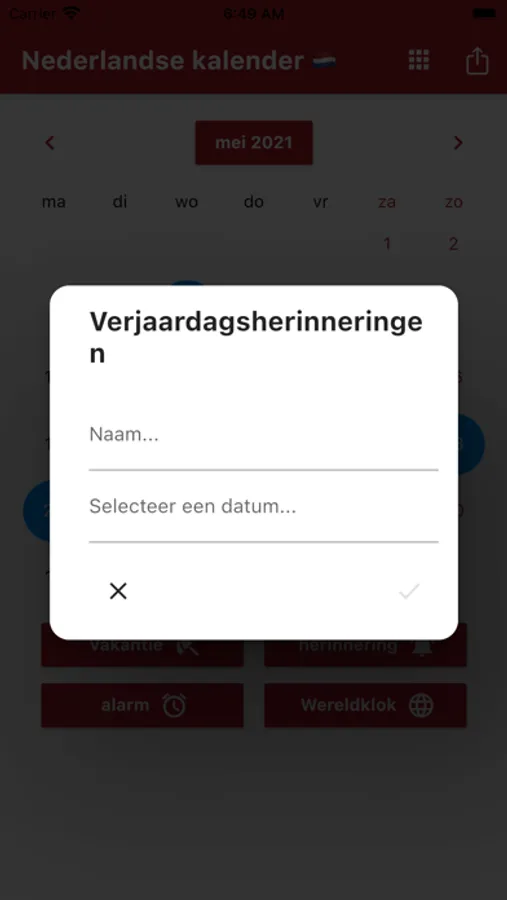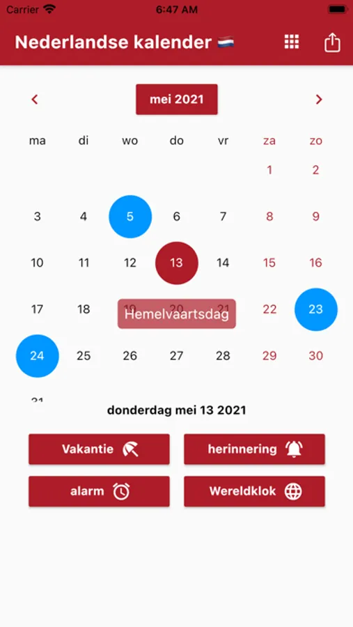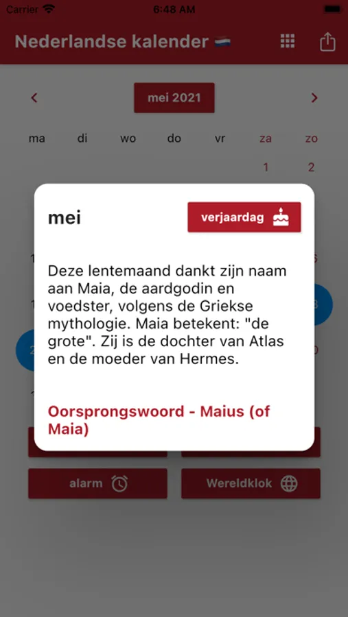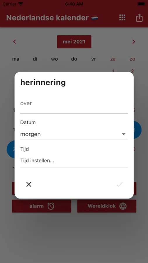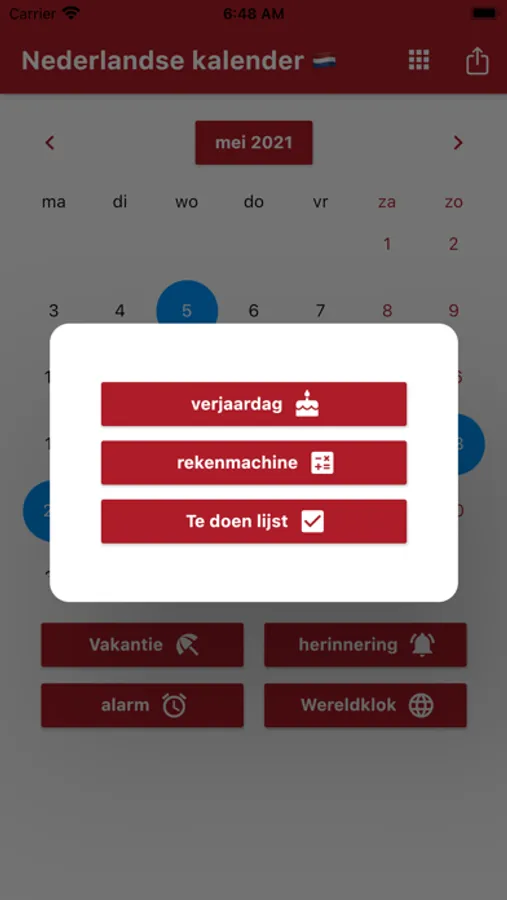 U kunt herinneringen instellen en op het juiste moment een melding ontvangen. Op nederlandse feestdagen herinneren we je er zeker aan. U kunt verjaardagen van uw vrienden en familie registreren om van tevoren op de hoogte te worden gehouden. Handige hulpprogramma's zoals een rekenmachine, wereldklok en alarm zijn inbegrepen. Wereldklok toont de tijd in verschillende steden over de hele wereld. Onze kalender bevat een takenlijst met de geschiedenis van de oorsprong van elke maand. Nederlandse lokale tijd. Vertaler.