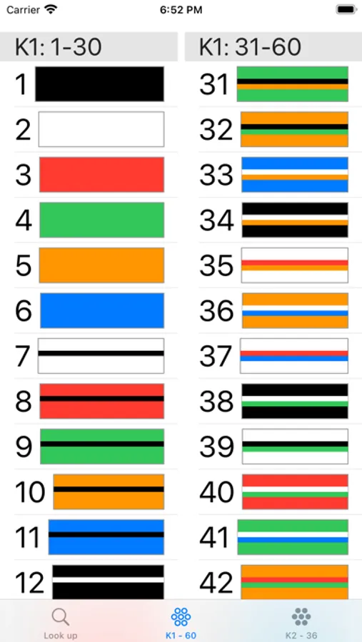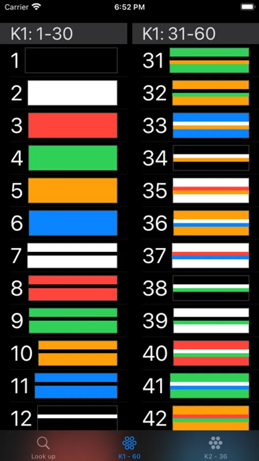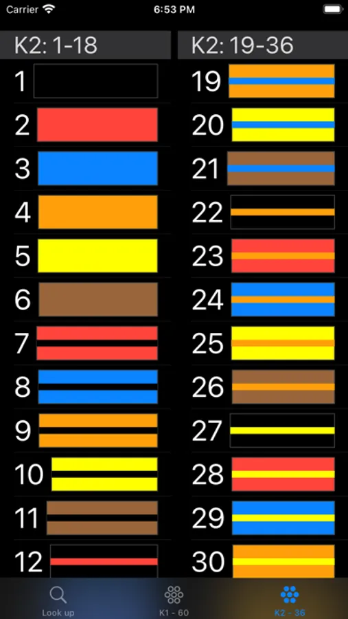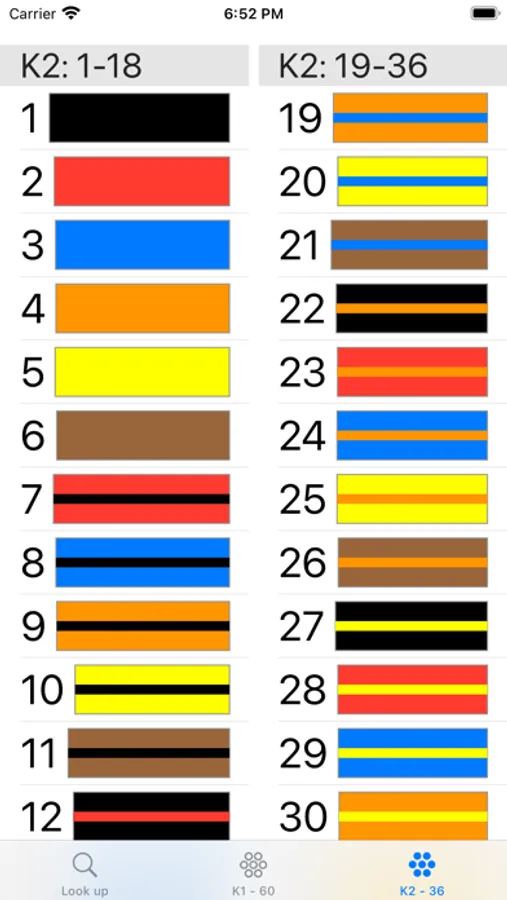 Look up the color codes using either K1 or K2 methods: