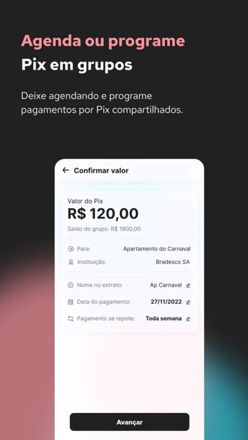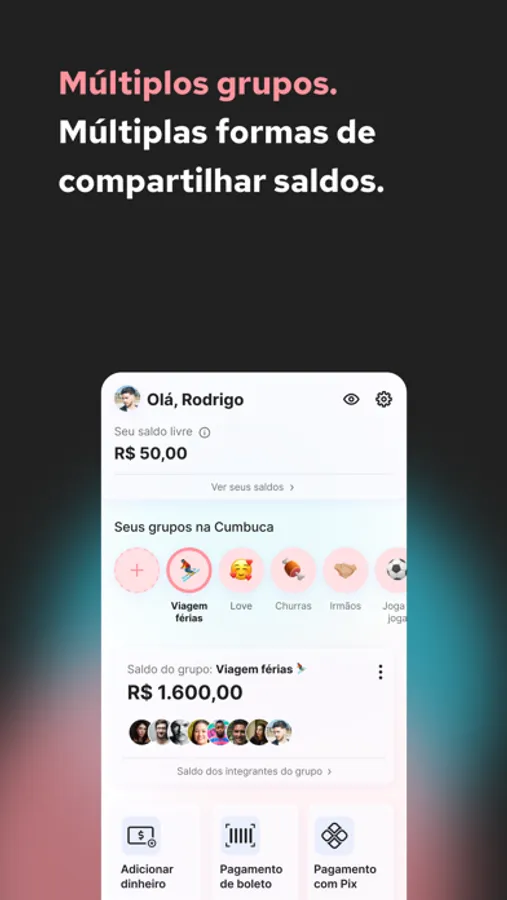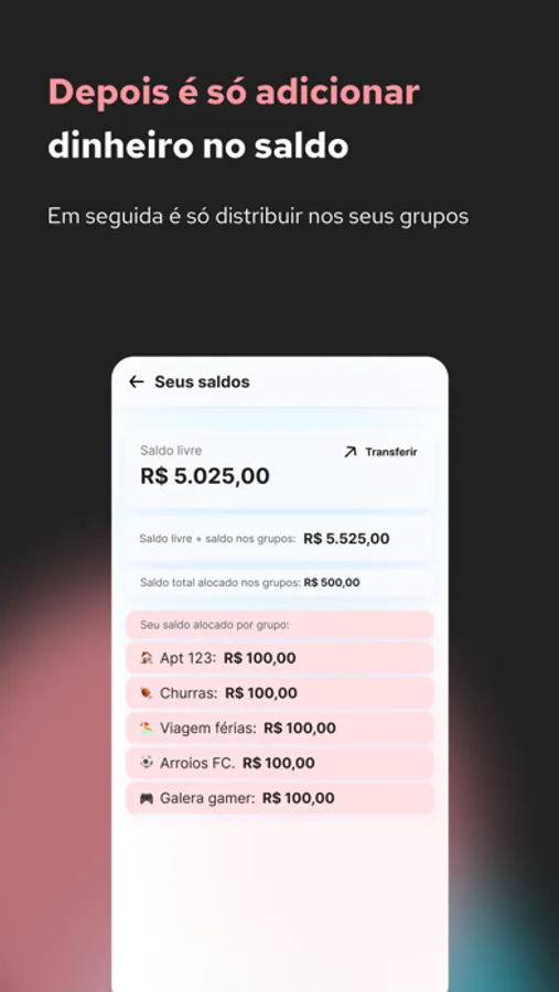 Para isso, basta depositar o dinheiro por PIX e alocar o saldo desejado em cada grupo. Os membros do grupo podem definir a proporção com a qual cada um contribuirá, tornando o processo de pagamento mais justo e transparente. Um pagamento pode ser dividido igualmente, em uma proporção de 80%/20% ou até mesmo com uma pessoa pagando usando exclusivamente o saldo de outro membro do grupo, assim, efetuando o pagamento de forma compartilhada.
