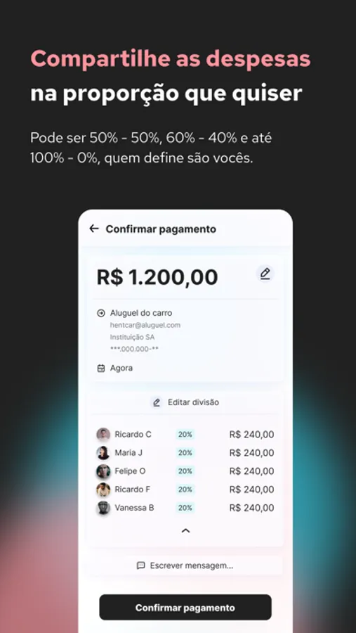 - É o primeiro aplicativo desenvolvido para rachar despesas com quem você quiser e em quantas pessoas quiser, seja no rolê, nas contas de casa ou em viagens.