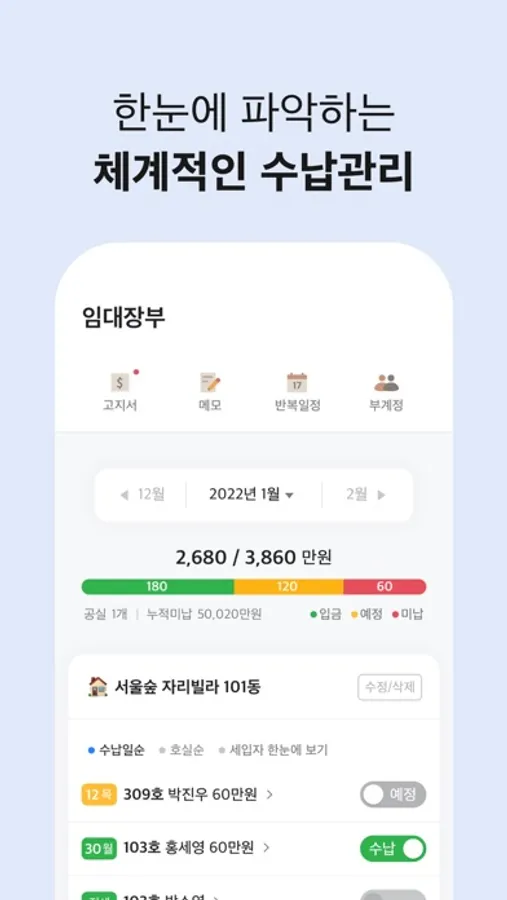 월세 수납 체크를 잊지 않도록 매달 알림을 드리고 모바일 임대장부를 자동으로 작성합니다.