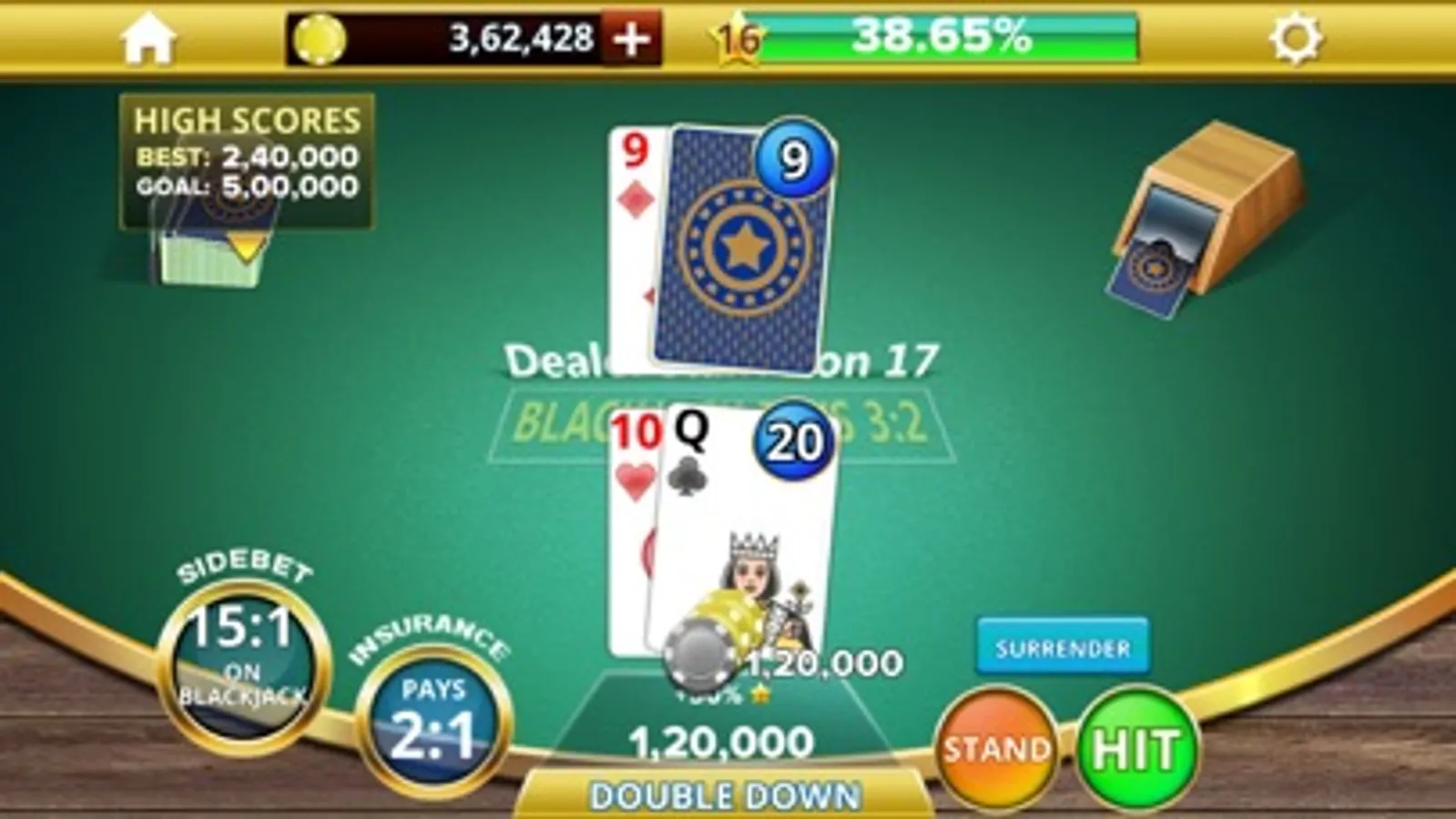 - Double Down, Splits, Insurance and Surrender for an authentic Blackjack experience.