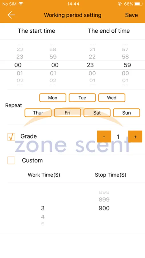 - Scent device App controling, including working hours, week,levels.