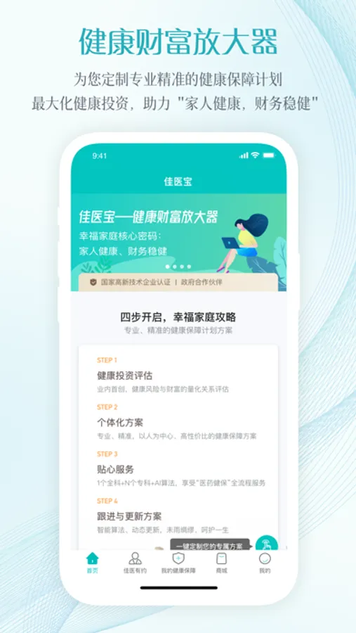 以人为中心,定制全生命周期全健康状态的专业精准的健康保障计划,最大化您的健康投资,助力每个家庭实现“家人健康,财务稳健”。