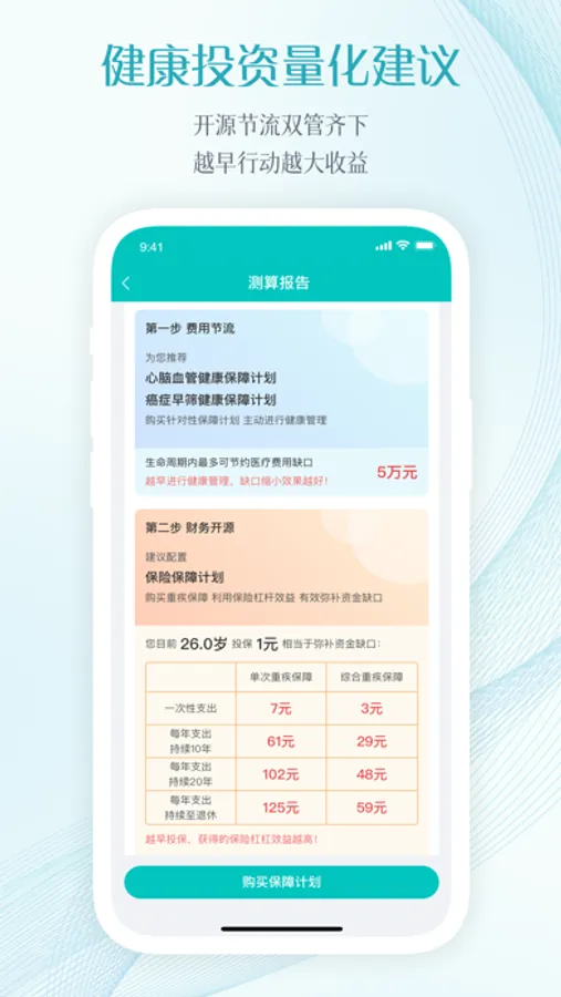 认识健康价值重要,采取行动更重要,开源节流双管齐下,堵住健康财务缺口。越早行动,越大收益。
