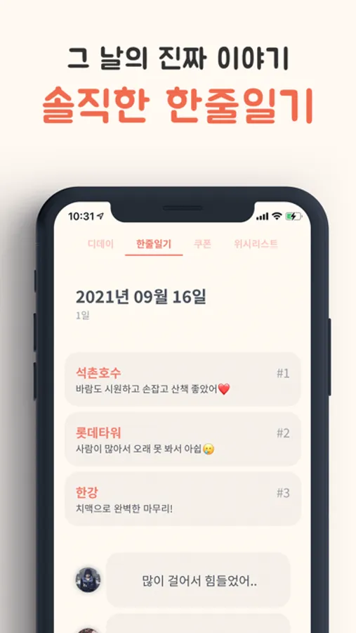 오늘은 어디에 갔었는지, 무슨 일이 있었는지 말해주세요. 한줄이면 충분해요