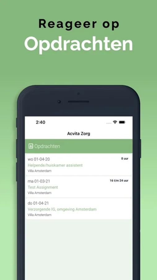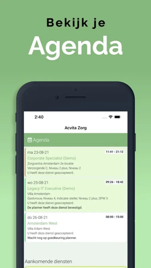 Met deze App kan je als flexwerker van Acvita Zorg o.a. diensten en opdrachten bekijken en accepteren, gewerkte uren registreren, facturen opstellen en verzenden, urenstaten en de agenda inzien.