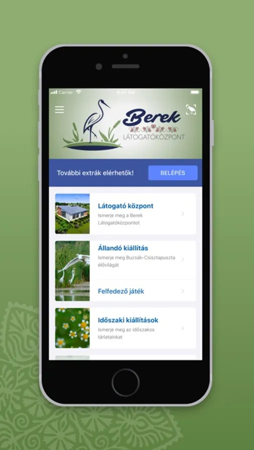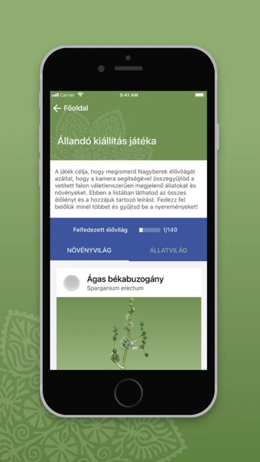 A játék célja, hogy megismertesse a Nagyberek élővilágával a felhasználót azáltal, hogy az alkalmazás segítségével összegyűjti az interaktív kiállítás vetítésekor megjelenő állat és növény ábrázolásokat. Az alkalmazás eleve tartalmazza az interaktív kiállítás vetítésén megjelenő élőlények listáját az "Állandó kiállítás játéka" menüpontban. Az ebben a listában található állatokról és növényekről a látogató részletes információkat talál, de minden listaelemhez begyűjthet egy jelvényt azáltal, ha az adott élőlény képét a mobilalkalmazás segítségével beolvassa az állandó kiállítás vetítéséről, 50, 100 és 149 összegyűjtött badge után a Látogató ajándékot kap a Látogatóközponttól.
