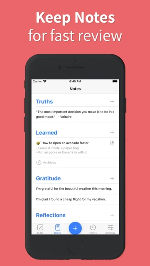 Review things you've learned, stay inspired with favorite quotes, practice gratitude, or simply reflect. All this and more with Motidayt notes - just a tap away from your to do screen.
