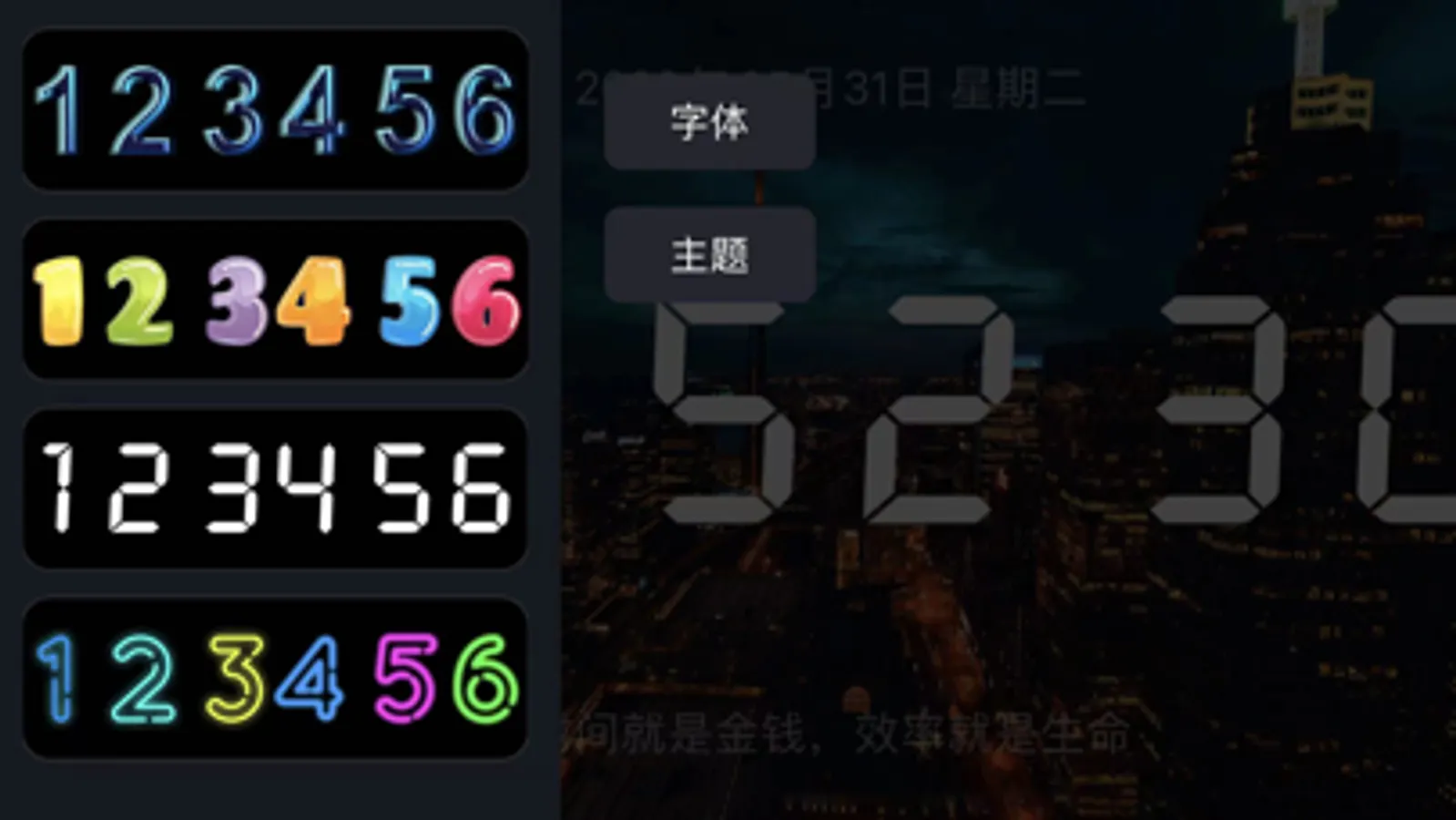 【海量创意主题】有超酷炫时钟主题,极简设计风格,如复古时钟、电子时钟、辉光管、fliqlo翻页字体、炫彩时钟、彩虹时钟、极简翻页时钟等样式