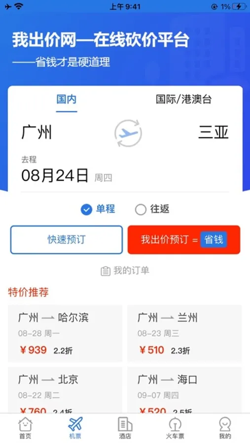 我出价-AI语言订机票酒店民宿旅游智能体