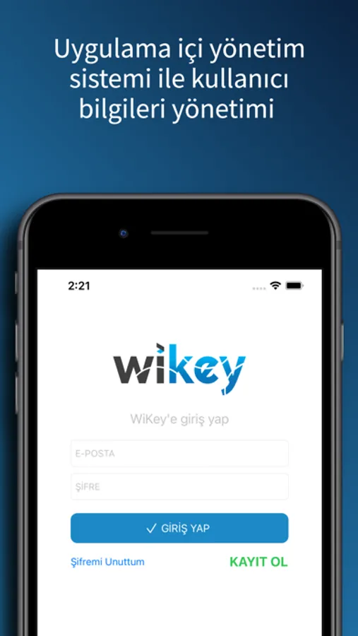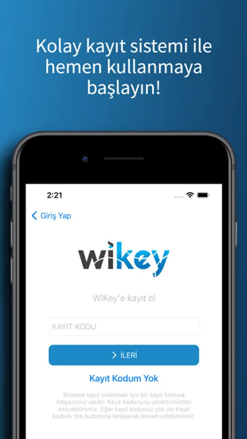 Wikey Kablosuz Kapı Kontrol Uygulaması Nasıl Kullanılır?Wikey kablosuz kapı uygulaması, yönetici tarafından sağlanan kayıt kodu ile uygulamaya kayıt olunarak kullanılır. Kullanıcılar kayıt kodu ile sisteme üye olurlar. Yöneticiler üye olan kullanıcıların yetki sınırlarını belirler. Bu sayede kullanıcılar uygulama ile otopark ve yaya giriş kapılarını kontrol edebilirler.