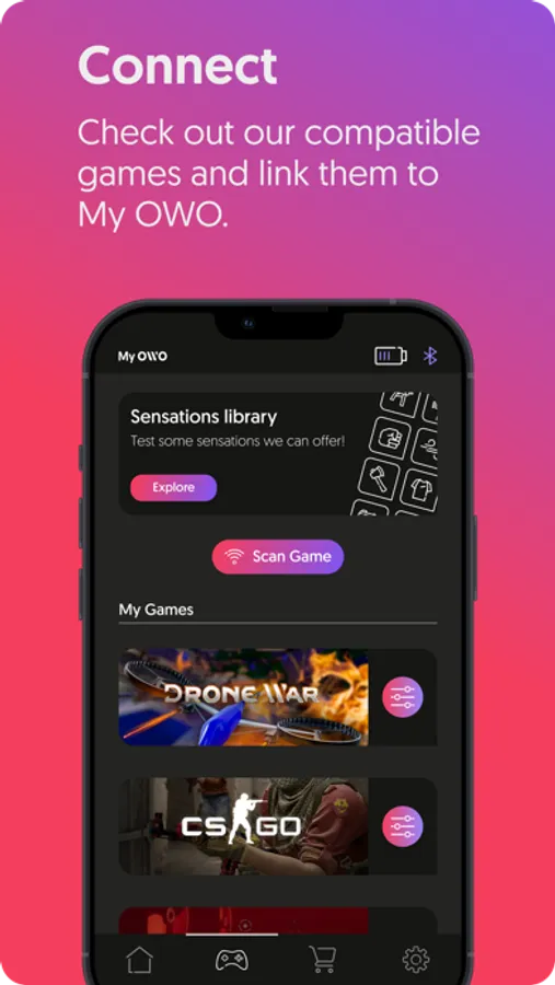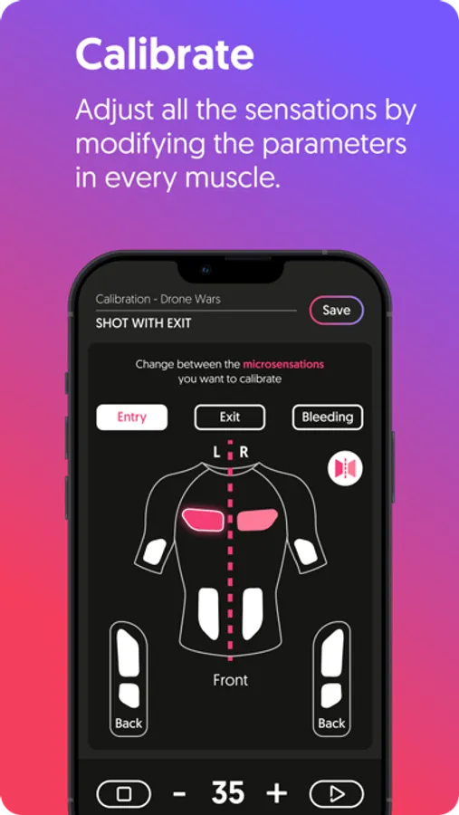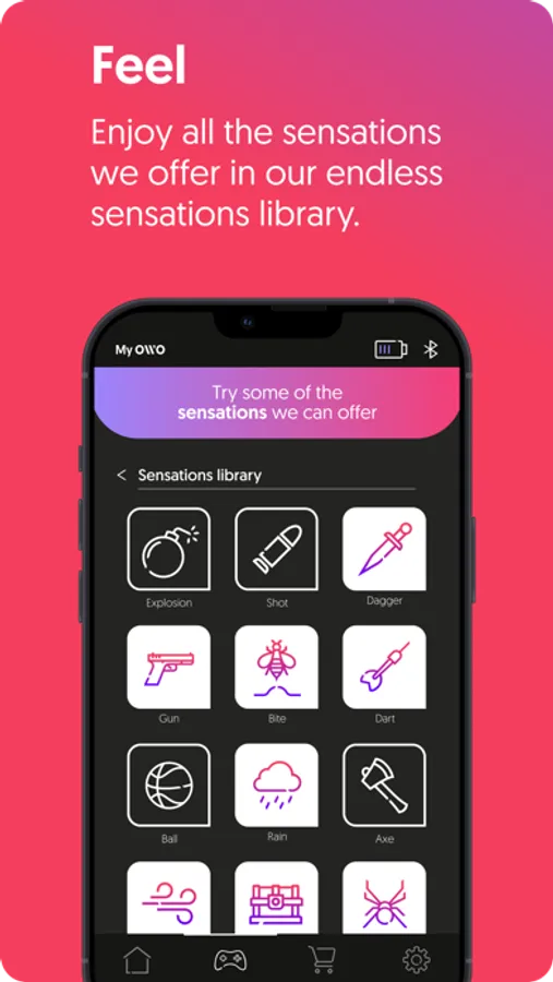With My OWO, you will calibrate the sensations to your liking, creating a completely customized experience. In less than 5 minutes you will set your initial calibration values for the sensations. After that, you will be able to calibrate the sensations of each game. Your calibration is saved on the cloud so you can access and modify it at any time. Change the parameters of each sensation in every muscle. Increase or decrease the intensity by changing the parameters of the sensations.
