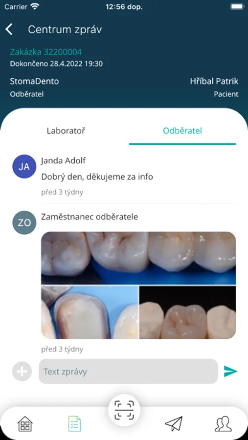 Chat nad zakázkou s možností obrazových příloh. Vše sdílené s lékaři.