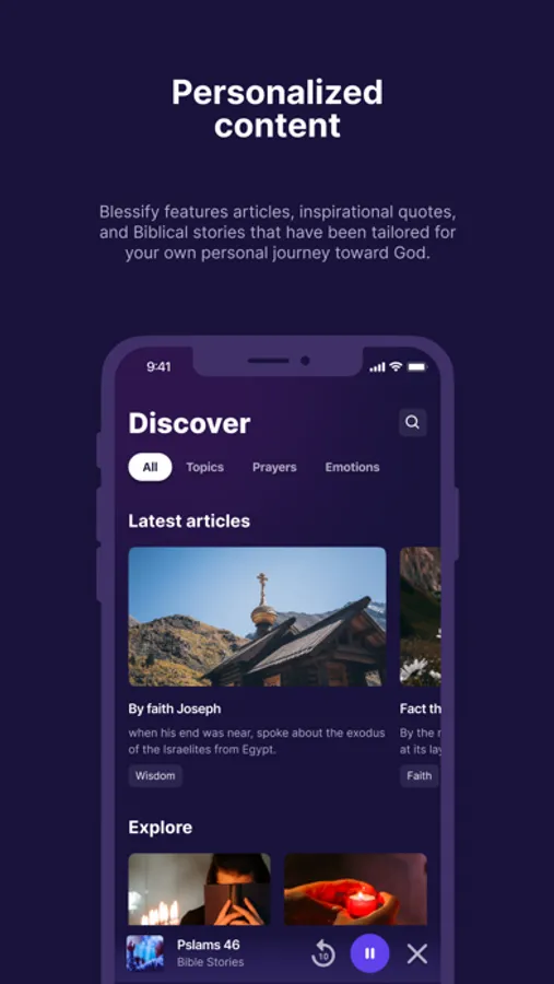 Meditate. Pray. Appreciate. Blessify is all about supporting you on your spiritual journey. Start and end your day with inspiring content and powerful prayers for a life-changing experience. Choose from hundreds of Bible verses, stories, sermons, songs, and meditative prayers to find peace in God.