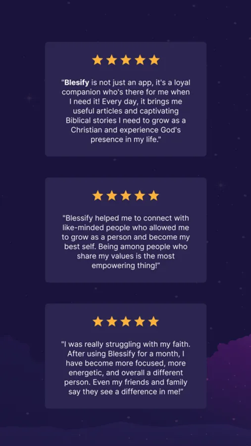 By joining Blessify, you’ll enjoy a large variety of Calming Bible Stories, Inspiring Bible Verses, Meditative & Healing Prayers, Empowering Sermons, Praise & Worship Songs, and Stories From the Community that you can listen to or read whenever you like.
