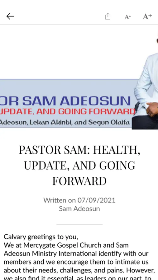 Pastor Sam Adeosun's ministry, Sam Adeosun Ministry (S.A.M) is an arm of Mercygate Gospel Church. His followers are spread throughout the world and his teachings are widely accepted among Yoruba-speaking Christians. Features include: