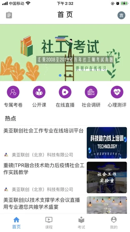 社会工作资源库是美亚联创面向广大社会工作从业者的一个开放平台,该平台提供提供专业的社会工作相关资源。涵盖社工考试、公开课堂、行业大赛、学术会议等相关资源。