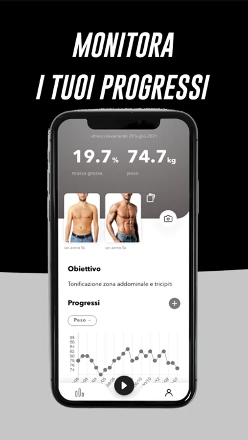 Avrai sempre sotto controllo la tua attività fisica: potrai visualizzare quali esercizi sono previsti nel tuo piano di allenamento, i tuoi progressi e come cambia il tuo fisico nel corso del tempo.