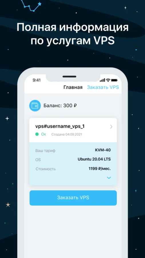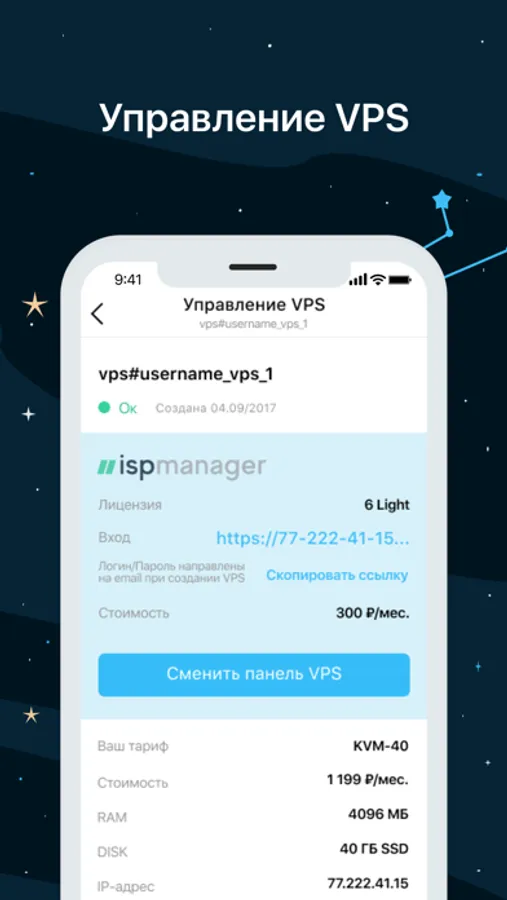 • управление услугами VPS – переустановка ОС и выбор ПУ, смена тарифа, удаление, клонирование