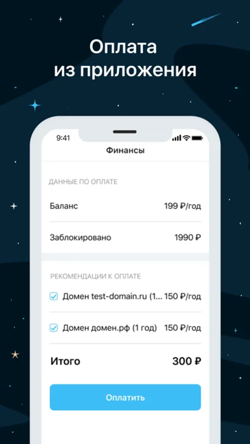 • управление финансами — просмотр баланса и количества доменных бонусов, настройка автоплатежа, пополнение баланса