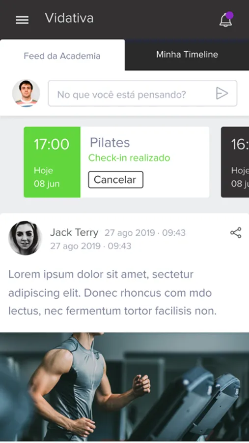O aluno, através do app ACADEMIA VIDATIVA, pode interagir com os outros alunos através da timeline, conferindo, curtindo e adicionando notícias; acessar sua ficha de exercício com histórico de evolução de cargas; acompanhar suas avaliações físicas e fazer check-in nas aulas. Tudo isso na palma de sua mão para deixar seu treino mais dinâmico e interativo.