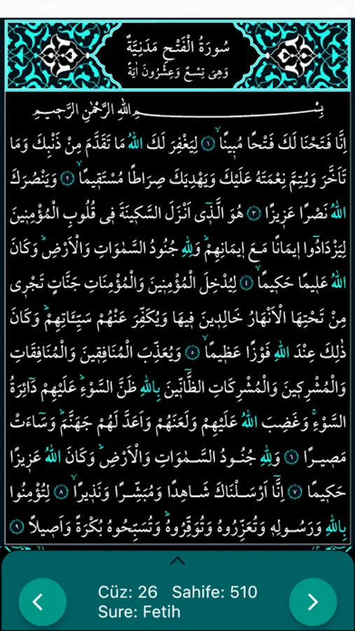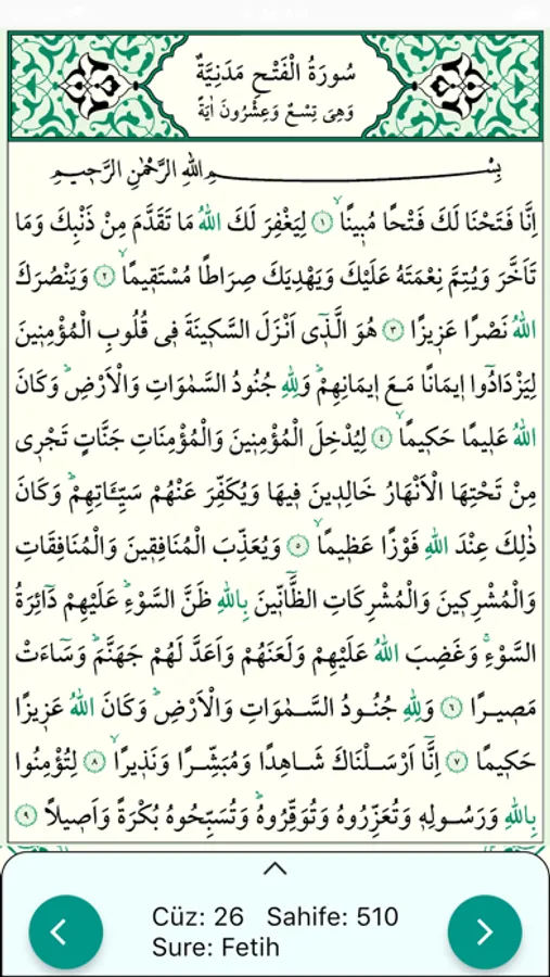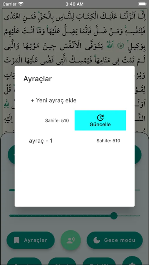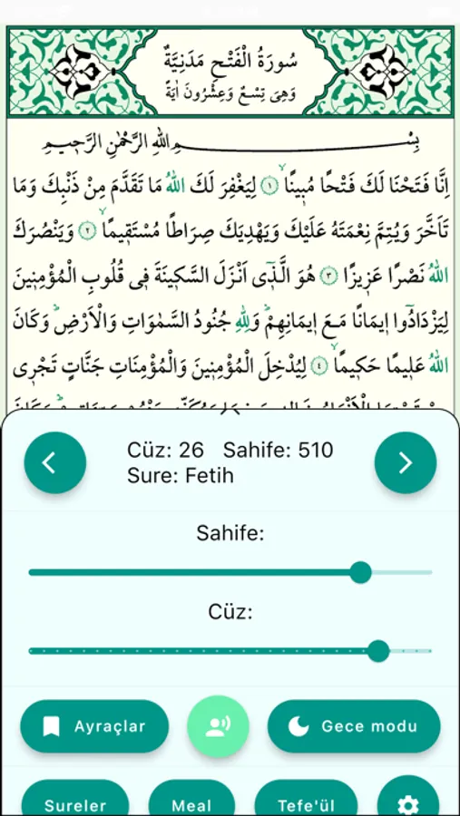 Kur'an-ı Hakîm'i ve Mealini mobil cihazlarınızda, gözlerinizi yormayan koyu ve açık temalarla okuyabilir, elinizin altındaki pratik kontrollerle istediğiniz sayfa, cüz, sureye kolayca gidebilir, istediğiniz sayıda ayraç ekleyebilir, bu ayraçları yana kaydırarak silebilir ya da güncelleyebilirsiniz. Hem IPhone, hem IPad ekranında rahat okuyabilmeniz için sade ama verimli bir arayüz sunmaya çalıştık.