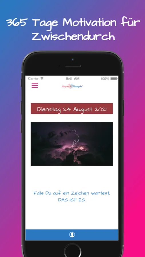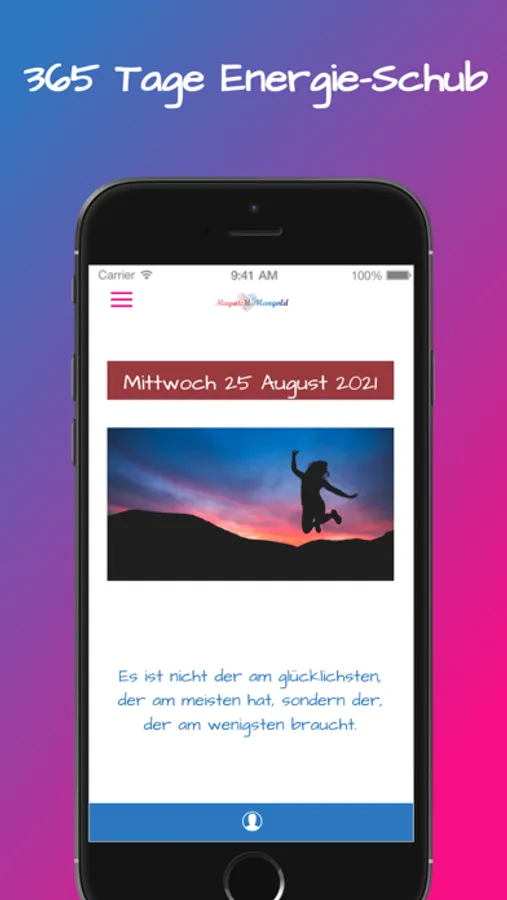 Dieses einzigartige App versorgt Dich 365 Tage mit Lebensfreude, Motivation und Inspiration. Es gibt Dir Denkanstösse, Gedankenimpulse und Motivationsschübe mehr aus Deinem Leben zu machen.