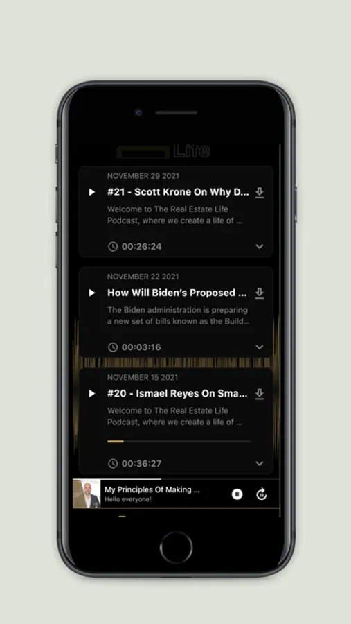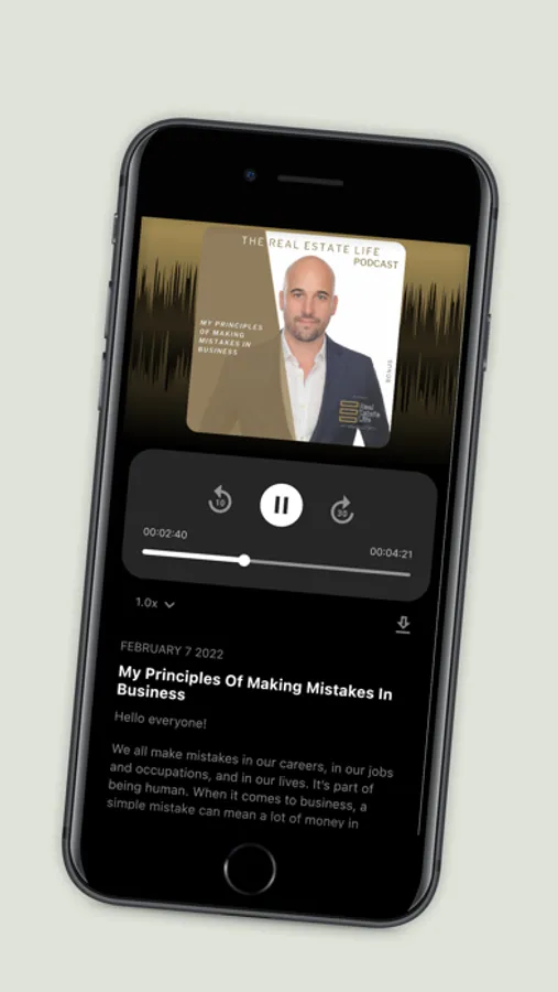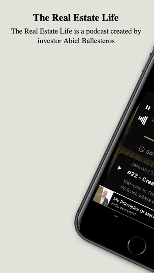 This app is designed to listen to The Real Estate Life podcast. It provides access to every chapter and is updated as new episodes become available. Users can listen to the podcast even if minimizing the app or allowing their iPhone to close. Also offers controls to play, pause, and rewind or go forward a few seconds, as well as to change the episode selection.