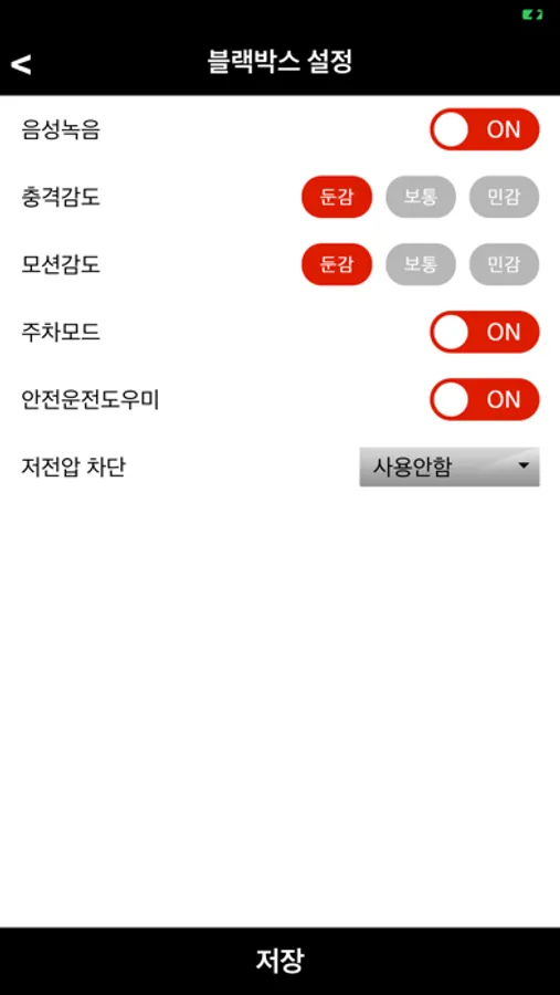네번째. 블랙박스 설정 기능으로 블랙박스의 충격감도 조정, 각종 모드 on/off 기능, 저전압 차단 볼트(V) 조정 등의 기능을 지원함
