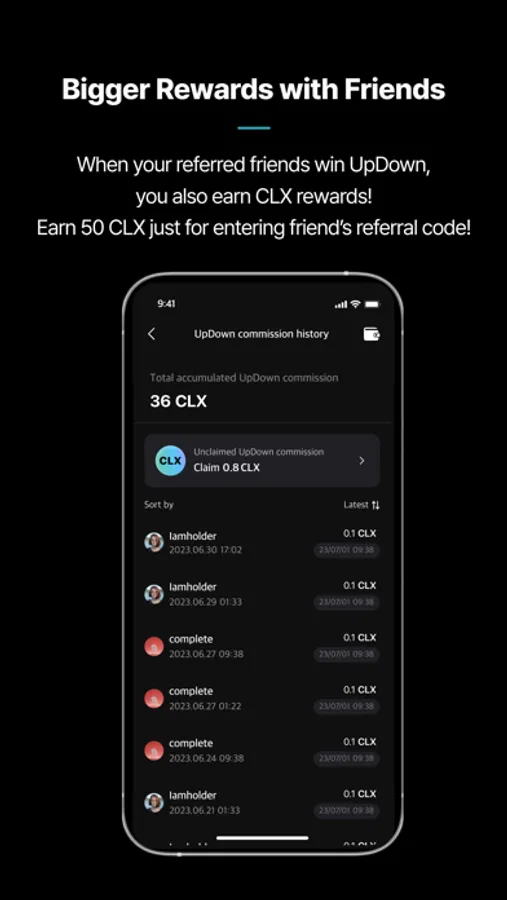 - Share your invitation code with friends. When your friend enters your code and completes UpDown, they'll receive 50 CLX instantly. Plus, you'll receive 10% of your friend's UpDown win reward each time they win (unlimited).