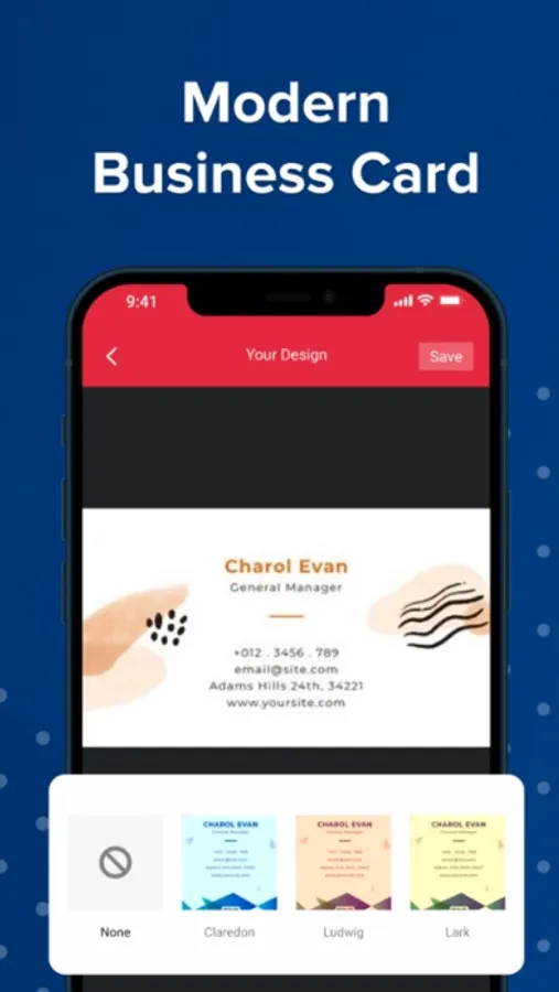 Business Card Maker is free and easily create your own business card like a professional business card designer in just a few seconds, just enter your details and choose from multiple business cards created.
