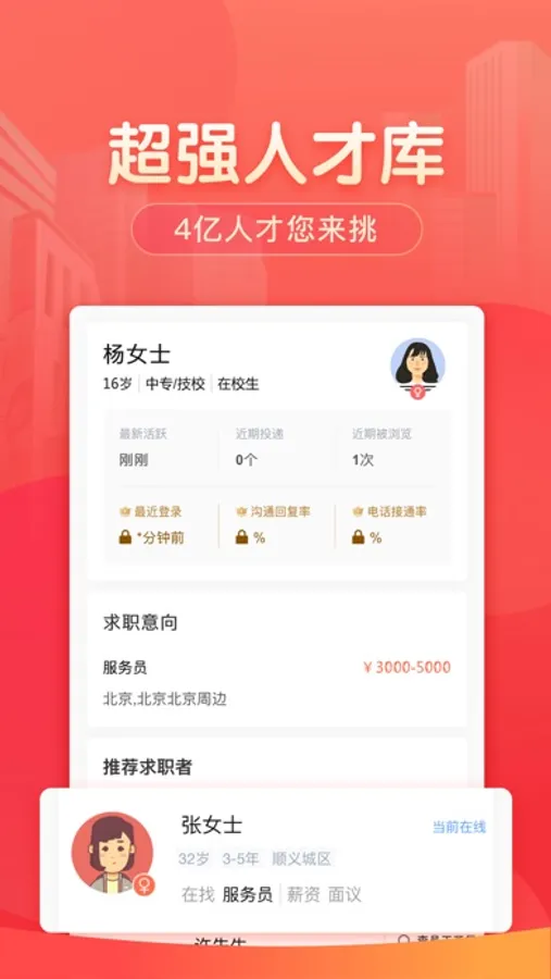 你能想到的职位信息,可以在58同城简历库里找到,全职位模板供你选择,同求职者在线视频、直接面试,当天可入职!
