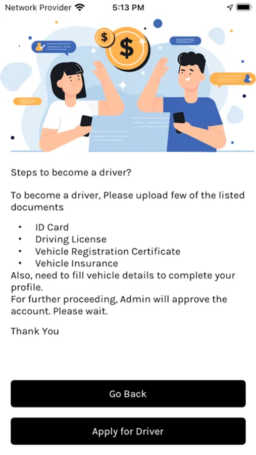 Drivers has to upload their id proof and other documents, and get approved from the administrator to start.