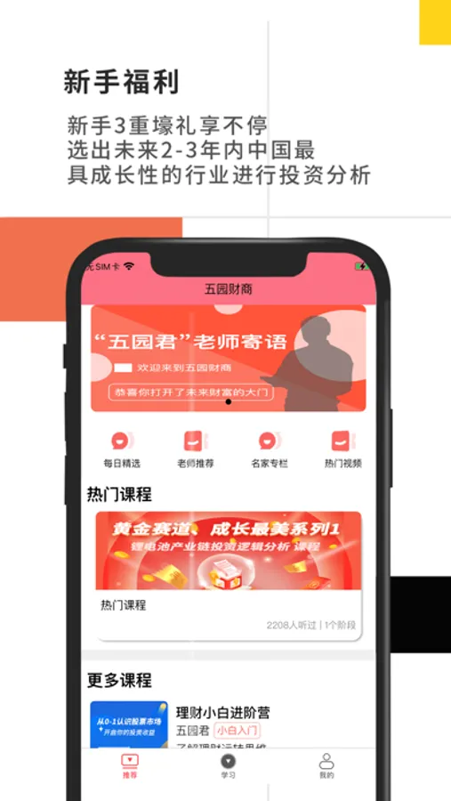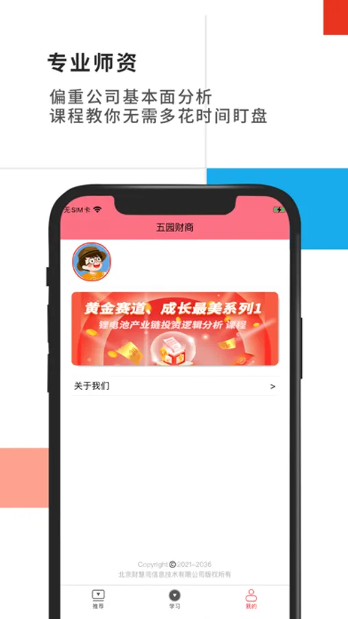 五园财商app是由北京财慧苑信息技术有限公司开发,以服务个人及家庭理财投资的一款股票、金融、基金、投资课程学习软件。课程从易到难,易学易懂实操性强,使你能够快速的建立自己的投资交易体系。并有名师指导,使你无后顾之忧的学习。课程分为价值投资基础知识、估值体系系统课、成长最美系列课程锂电池板块、以及引爆起涨点等短线操作课程组成。我们的课程以价值投资理念为基础,系统性的教您如何从4000支股票中选股、如何看懂底层投资背后逻辑,教你如何快速的读懂公司的财务报表以及估值、基本面的分析方法。挖掘出有价值有潜力的公司。其中拳头产品黄金赛道成长最美系列,一经推出就广受好评,课程将选出未来2-3年内,中国最具成长性的行业进行投资分析。目前规划包括有锂电池、白酒、医疗服务、半导体等行业。课程将根据不同的行业特征进行针对性的分析研究,并找到该行业的投资逻辑和市场炒作的脉络,以及行业内的龙头个股有针对性的分析。助你抓住黄金赛道里最美的成长股,与伟大的企业一起成长,实现财富增值。