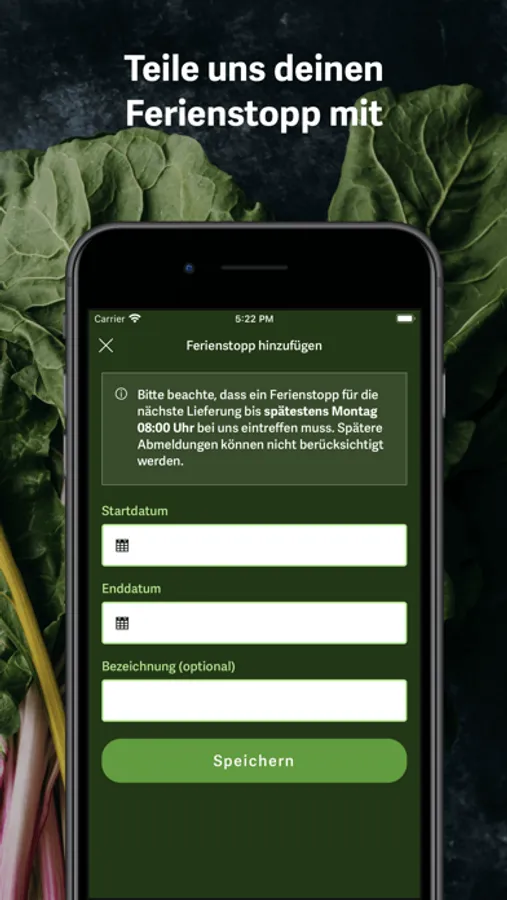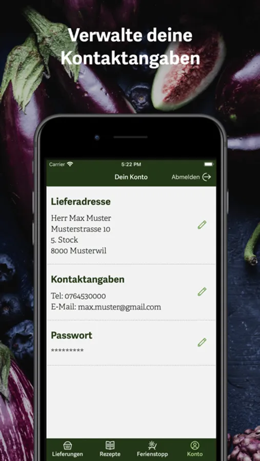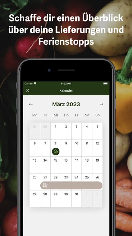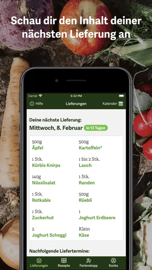 Mit der Bio Mio-App siehst du den Inhalt deiner nächsten Lieferung und erhältst die passenden Rezepte dazu. Ebenfalls kannst du Ferienstopps mit wenigen Klicks erfassen sowie Adressänderungen vornehmen. Und: Der Kalender bietet dir jederzeit einen Überblick über deine nächsten Lieferungen sowie deine Ferienstopps.