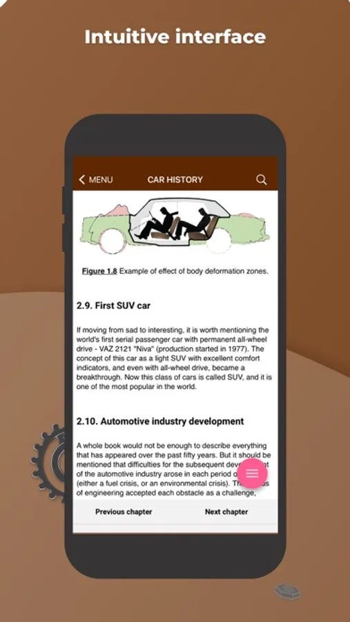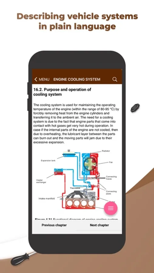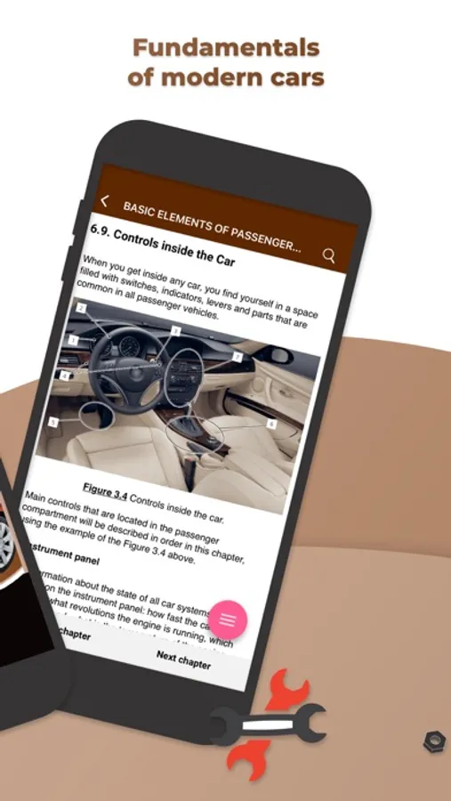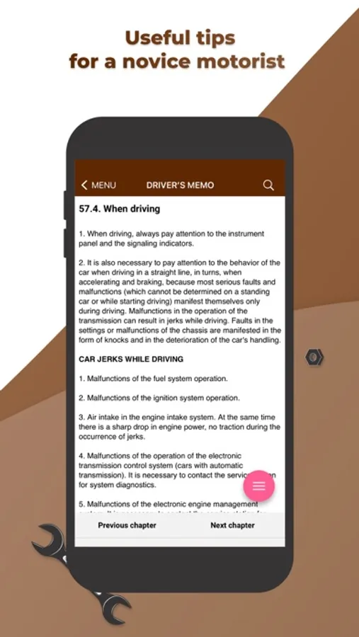 Getting started on this application, we set a goal to present a rather difficult theoretical course on the automobile engineering in the most accessible form. Basic knowledge of vehicles' structure will supply a novice driver with confidence in the fact that he will be able to control the situation of any breakdown, predict the amount of necessary work at the service station and just can competently exploit its vehicle.