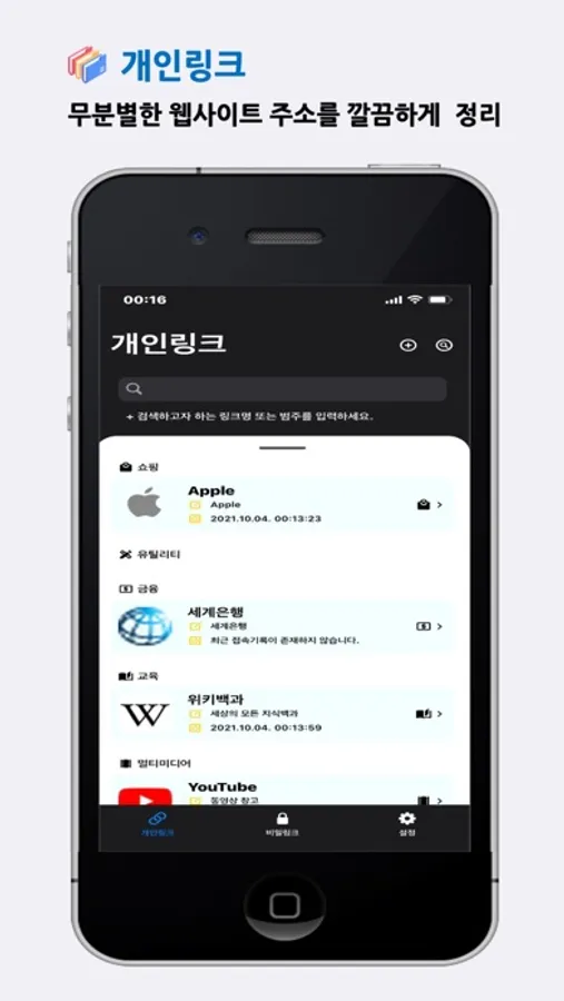 - 유투브, 유틸리티, 금융, 교육, 멀티미디어, 업무, 애완동물, 게임, 취업, 기타 등의 여러가지의 카테고리로 정리가 되어 있지 않은 웹사이트 주소들을 관리하세요.